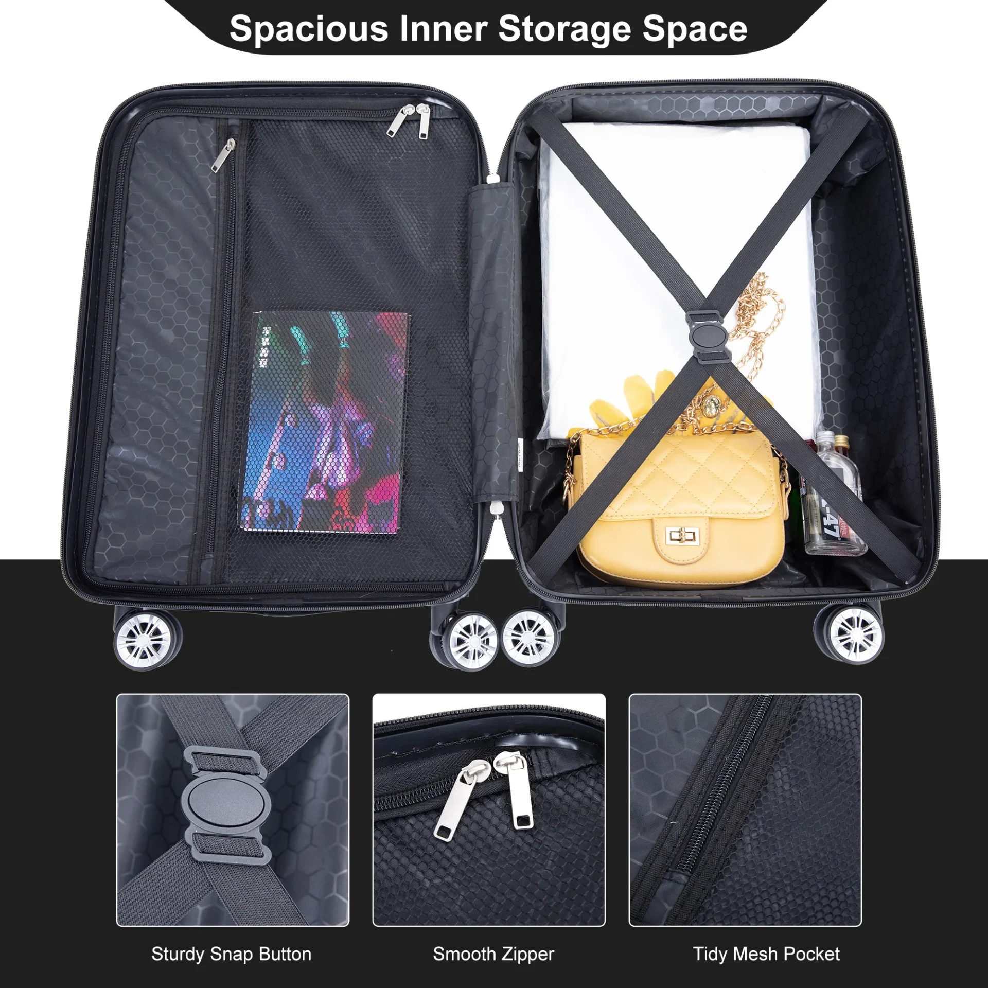 Spacious and Tidy Inner Storage Space: A sturdy snap button fixes clothes, and a mesh pocket stores toothbrush, makeup, etc.